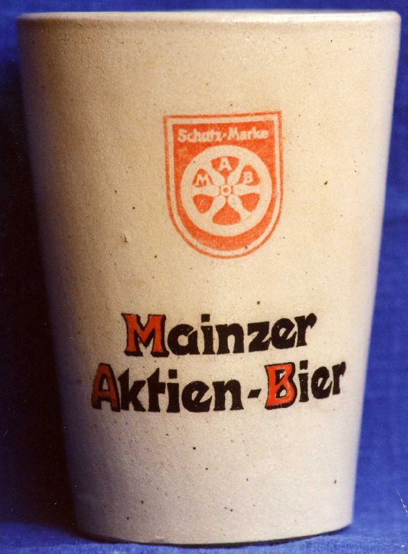 MAB 0,25 L. “Mainzer Aktien-Bier” (schwarze Schrift, rote Anfangsbuchstaben) Beiger Becher (Schutz-Marke 27 mm hoch x 23