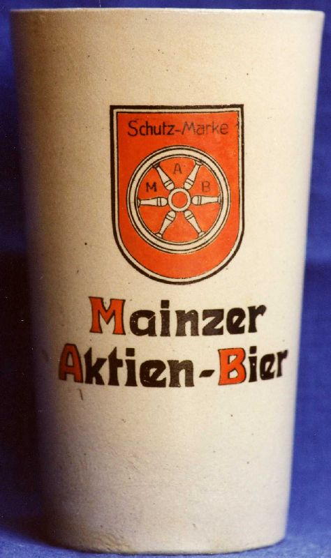 MAB 0,25 l “Mainzer Aktien-Bier” (schwarze Schrift, rote Anfangsbuchstaben) Grauer Becher (SCHUTZ-MARKE 42 mm hoch x 32